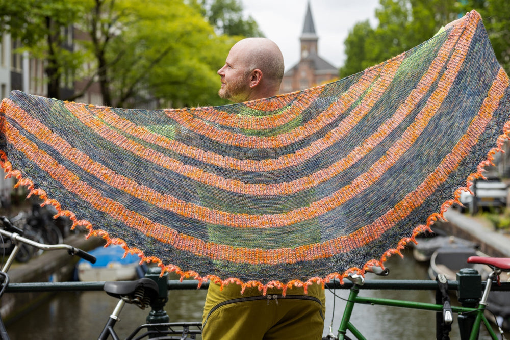I used Qing Fibre’s fingering weight Yak Singles yarn for the main color with their Melted Baby Suri for the cloudy contrast color. The large size is dramatic and fun to knit with the perfect blend of entertaining stitches and relaxing rows.