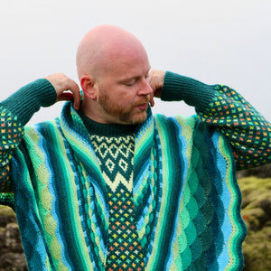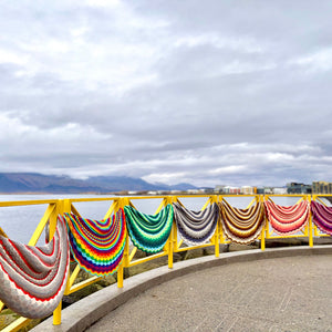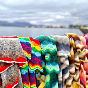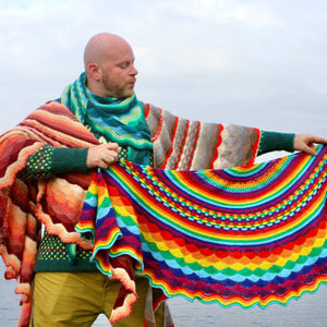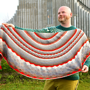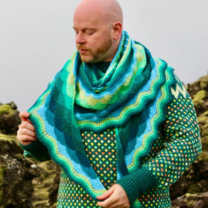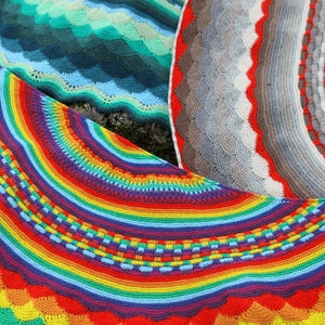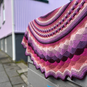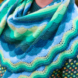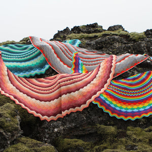 Choose eight colors of fingering weight yarn to knit this top-down shawl inspired by the landscapes of Iceland. The semi-circle shape begins with easy garter stitch stripes. Then, the colors mix and mingle in a syncopated brioche section. There is also a simple seed stitch non-brioche option to follow. The garter stitch stripes provide a relaxing and meditative quality, so you can enjoy your beautiful colors. All eight shades weave in and out of each other in a woven slip stitch motif. The final border features a mountainous short row section flowing into wavy eyelets. This colorful shawl is ideal for partial skeins or 50g skeins like West Wool Bicycle. Channel your favorite natural landscape into a collage of stripes and wrap yourself in colorful stitches.