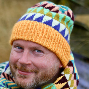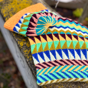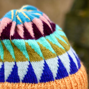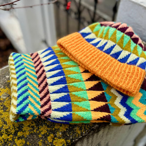 Select eight colors of fingering weight yarn to knit this stranded colorwork hat. The hat begins with twisted ribbing knitted in the round and then folded to form a double-thick ribbed hem. Triangles in stranded colorwork form the body of the hat for a bold geometric effect. Decreases spiral toward the top of the hat. Dive into your stash or try some color pop skeins of West Wool Bicycle to defend yourself against the shivers.
