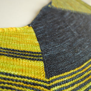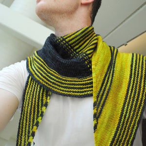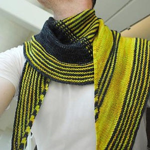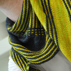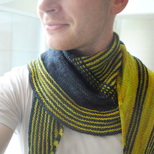 This modern interpretation of a shawl begins at the top, with the columns of slipped stitches, and grows outward with increases. Clean lines and asymmetric sections accent beautiful yarns and high contrast color choices. The resulting shape is stylish and easy to wear for both men and women.