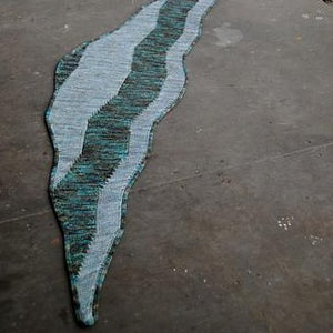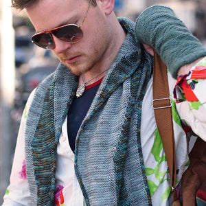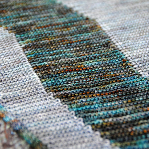 The body of this shawl is knit entirely in garter stitch with intarsia colorwork. Increases and decreases at the edge form a long and shallow shape mimicking a puffy cloud. The perimeter is finished with a smooth I-cord edge.