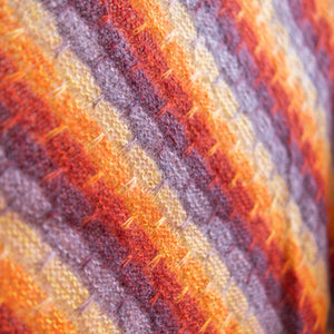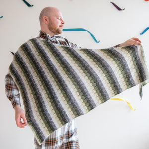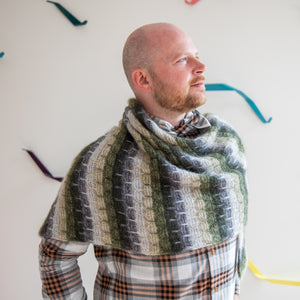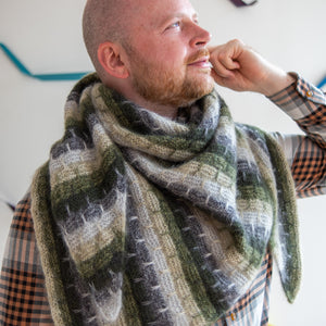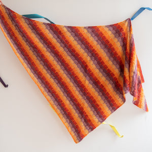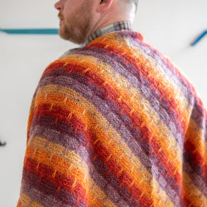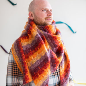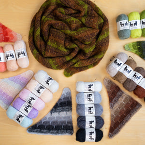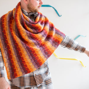 Gather five shades of lace weight mohair silk to knit this cloudy triangular shawl. The fading marl technique blends the colors together as you work garter stitch with slip stitches. Two strands of yarn are always held together for a deliciously frothy fabric. You can customize the size by knitting more pattern repeats for a big shlanket or simply bind off early for a smaller shawl. I-cord edges frame this classic shawl shape.