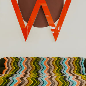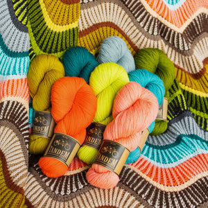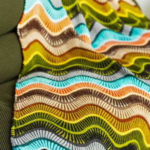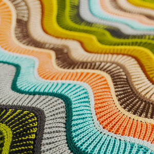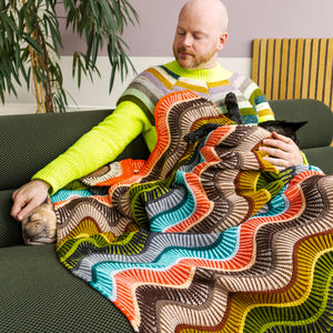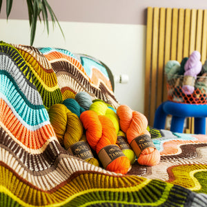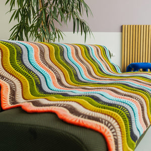 This large rectangular blanket is knitted with DK weight wool. Bands of two- color brioche are accented by reverse stockinette stitch stripes. Increases and decreases after each thin stripe form the smooth waves in the fabric. The sample features 24 colorways of West Wool Tandem, one skein of each color, for a bold and dynamic contrast effect. This blanket is perfect for single skeins. You can also knit a large stashbusting version by diving into your collection of DK weight wool. This bold blanket is a great size for decorating your couch or bed, keeping you cozy and warm.