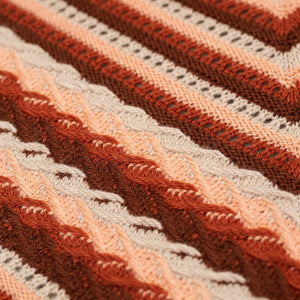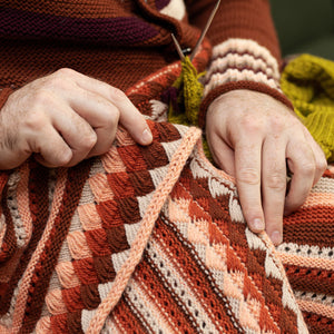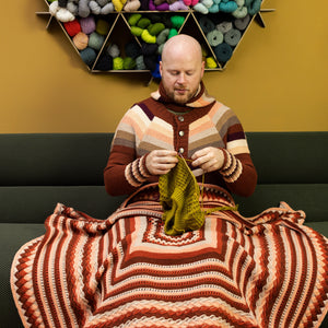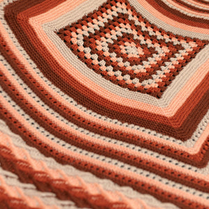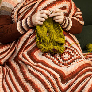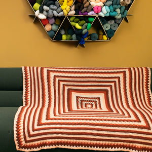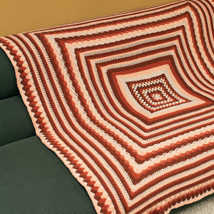 This square blanket is a colorful collage of stripes and textures. Choose four colors in a gradient from light to dark and work each section in the round from the center outward. The blanket begins with a crochet granny square followed by garter stitch and eyelet stripes. As the blanket grows larger with increases at each of the four corners, a beautiful zig zag slip stitch pattern is introduced producing a woven effect. The final border features all four colors with a dip stitch technique. Enjoy creating this special DK weight blanket with woolly yarns like West Wool Tandem. The large size is perfect for a cozy couch blanket or decorative bedspread. -
