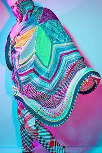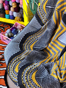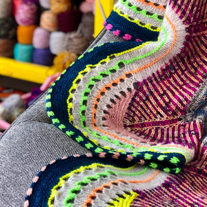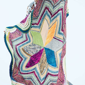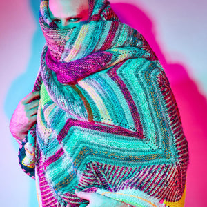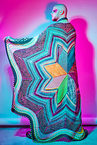 This circular blanket begins in the center with the star shape. Stripes, brioche, short rows, and eyelets continue around the star to form the large cozy size. Choose DK weight yarn in four contrasting colors or dive into your collection of yarns to make a scrappy colorful version. The Starflanket makes a graphic statement piece for your living room or bedroom.