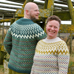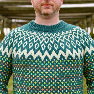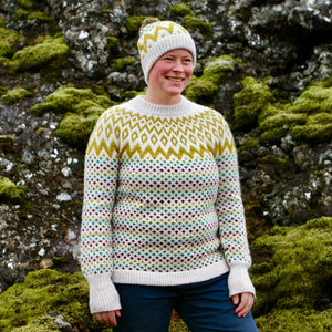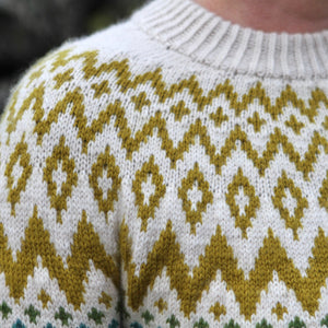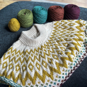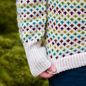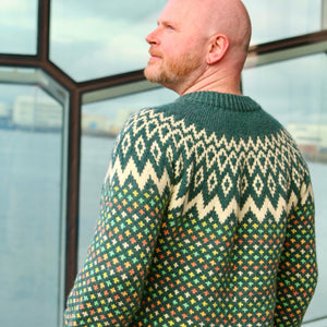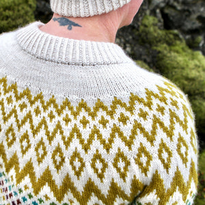 This top-down sweater is knitted with stranded colorwork in DK weight wool. Choose one main color and 5 contrast colors for the geometric accent pops. You can use as many contrast colors as you like to customize the stranded motifs. Twisted rib folded hems finish the neckline and body edge while long ribbed cuffs complete the sleeves. Try on the sweater as you knit to achieve the perfect yoke, body, and sleeve length. This cozy sweater with transport you to the stunning landscapes of Iceland.