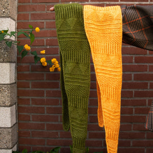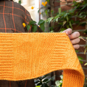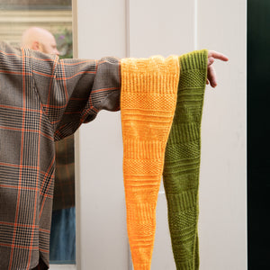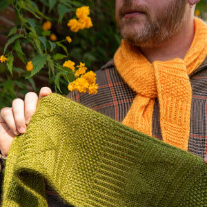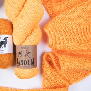 This textured skinny scarf is a quick knit filled with simple stitch patterns. Begin at the wingtip with an I-cord cast on. Increases at one edge gradually shape the little shawl followed by decreases. The long skinny shape is very fast to knit and the shifting stitch patterns make for a motivating knitting experience. Hold one strand of DK weight West Wool Tandem together with a coordinating color of West Wool Glowhair, our lace weight mohair silk. Once you make it, you will be itching to cast on another color for your friend. The gratifying pace of this project makes it perfect for gift knitting!