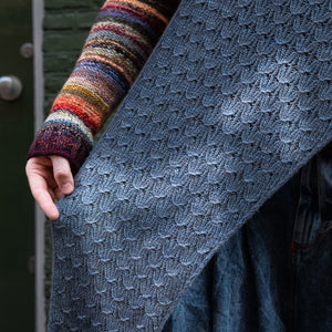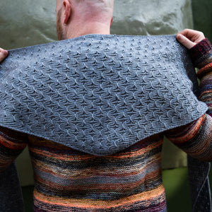 This large blue shawl features one strand of fingering weight yarn without any mohair silk marled with it.