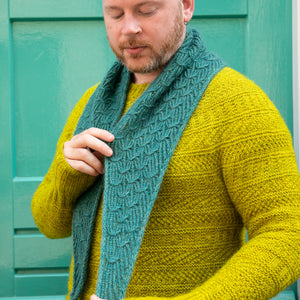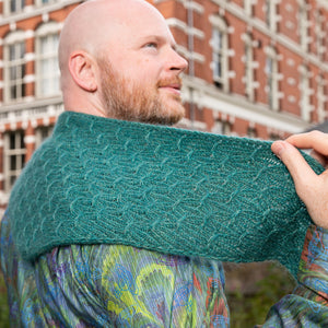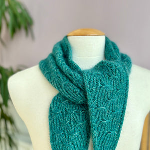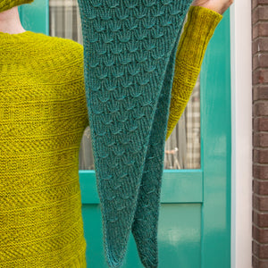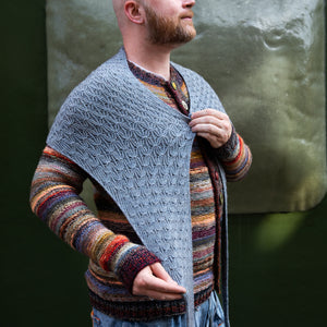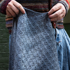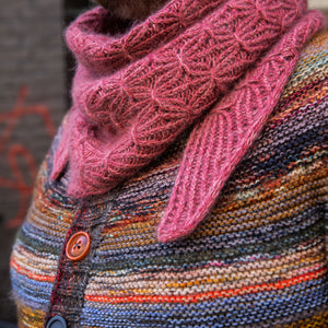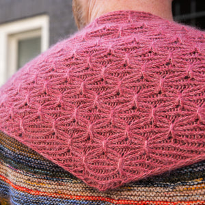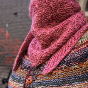 This triangular shawl begins at the corner with an I-cord Tab Cast On. Increases at one edge shape the fabric with twisted ribbing. A smocked knitting stitch creates the beautiful, gathered texture throughout the design. Choose one color of fingering weight wool and hold it together with a coordinating color of lace weight mohair silk. I used West Wool Bicycle held together with Glowhair for a shimmering fluffy halo. The pattern includes video tutorials to help you cast on and work the smocked knitting technique. Instructions include a small and large size with tips to help you customize the size to work with any yardage amounts. Decreases shape the other half of the triangle, so save 50% of more of your yarn for the decreases to maximize the size of the shawl and ensure you don’t run out of yarn.