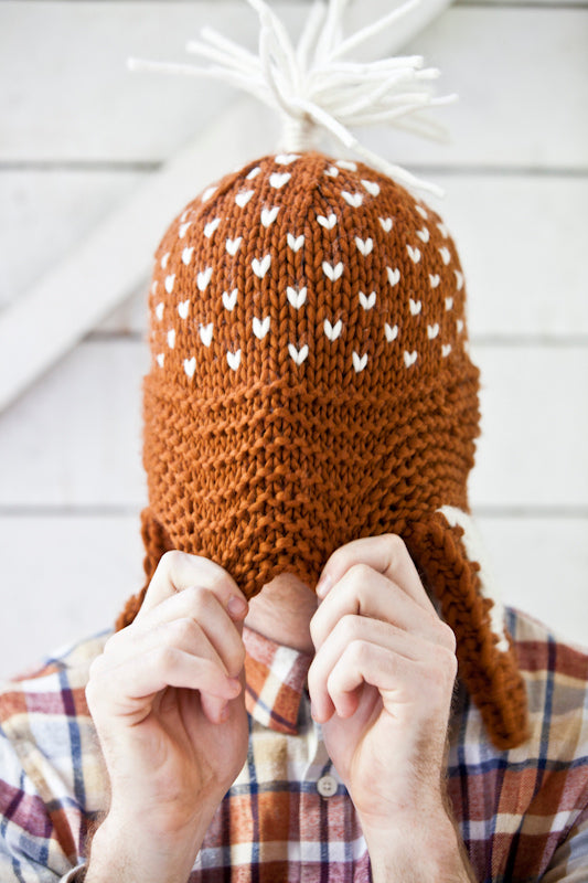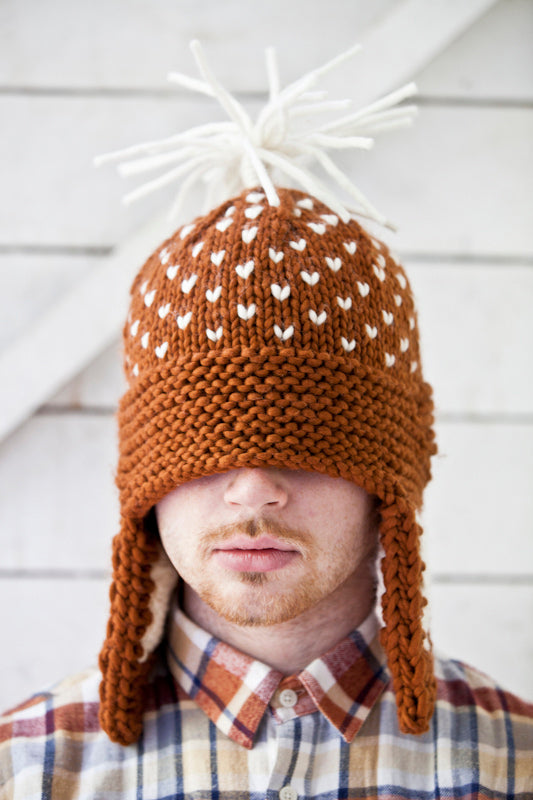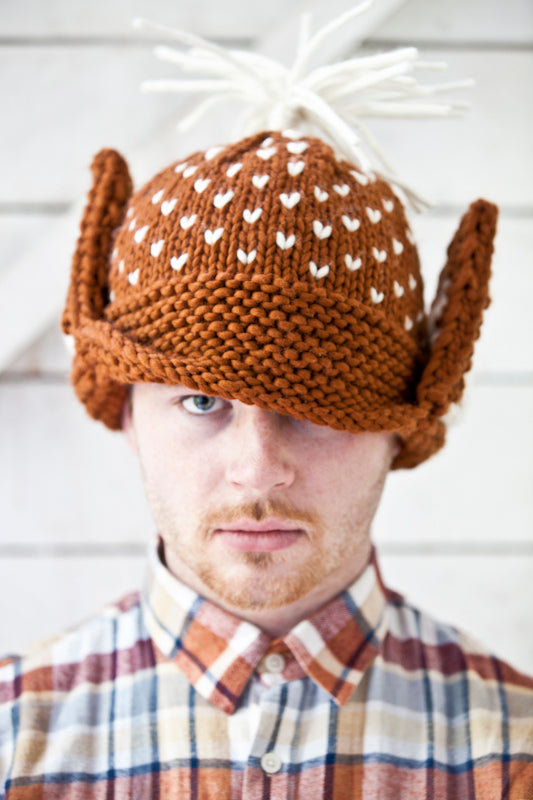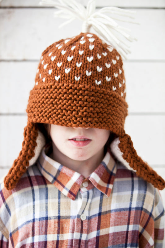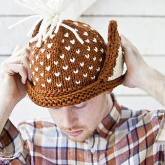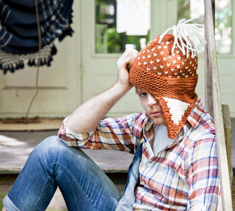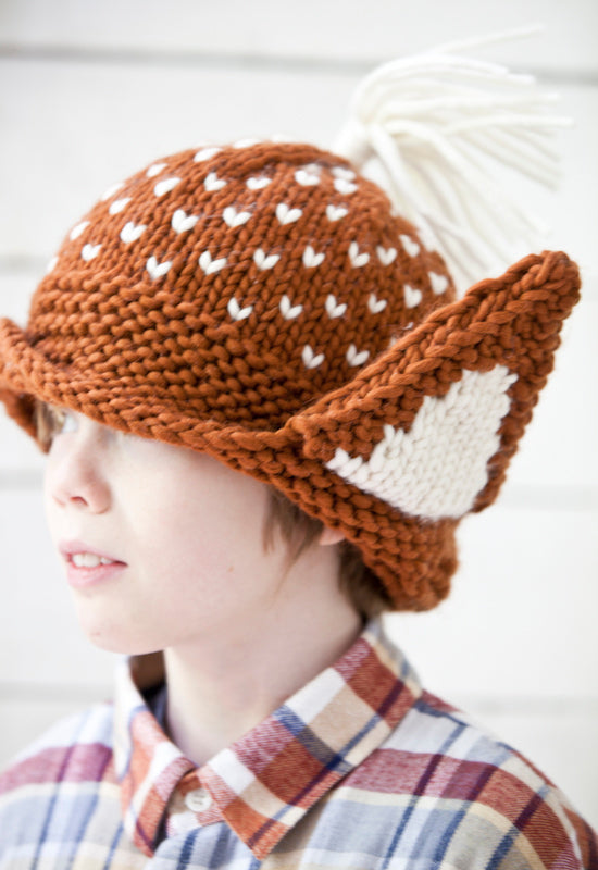 Hertenvos is a playful quick-to-knit hat. Two pointy earflaps are made double sided so they can be worn down or up like a sly fox. Simple stranding in the body of the hat creates spots that will make you feel like a baby deer. Choose a chunky yarn and enjoy the speedy knitting.