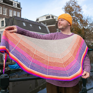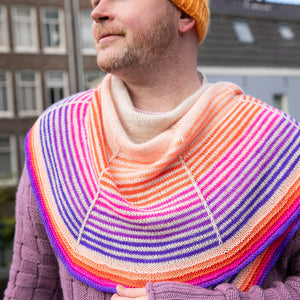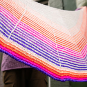 Daybreak is a beginner friendly shawl project knit top-down from the center of the wingspan edge to the border. Stockinette stitch with slip stitch stripes form the radiating sun motif. Choose one skein of each color (main color + contrast color) in fingering weight yarn for a graphic two-color version. You can use as many contrast colors as you like to create a gradient sunset effect. The pink purple sample features one main color in cream with six juicy mini skein color pops for the contrast colors. These contrast stripes are perfect for mini skeins or leftover amounts of fingering weight yarn. Self-striping yarns are also fabulous for a color changing contrast color. Daybreak comes in three sizes to accommodate a variety of different yarn amounts. Cast on this classic Westknits pattern and knit from the sunrise to sunset.