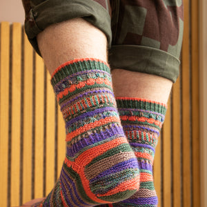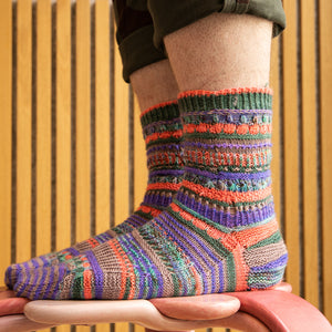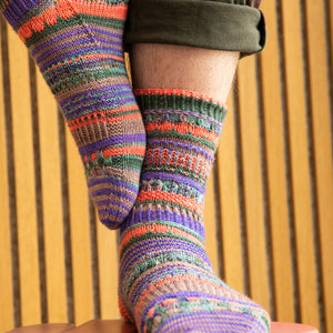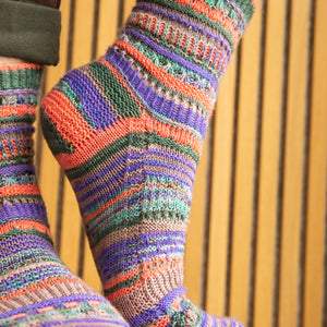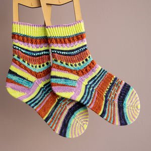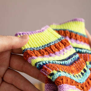 These top-down socks feature five mini skeins (20g each) of fingering weight sock yarn. Gather a contrasting palette and enjoy lots of textures like twisted ribbing, dip stitches, brioche, eyelets, slip stitches, and short rows. There are also instructions for a non-brioche section. These socks are packed with delectable stripes and collectible stitch patterns, making them very addicting to knit. Each section is accompanied by a video tutorial demonstrating all of the techniques step-by-step to knit these fabulous color pop socks.