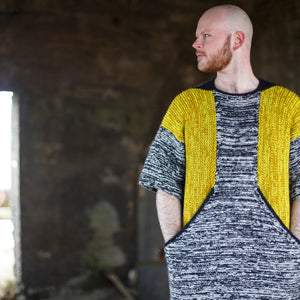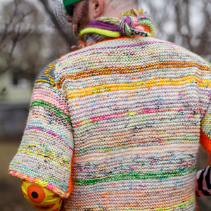 What would a kangaroo look like if it wore the speckled pullover of its dreams? Experience the cozy sensation of the Kangarullover enveloping your body in warmth.This squishy speckled garment is knit with several simple shapes that are seamlessly joined together using Westknits modular knitting techniques. Hold 2 strands of DK weight yarn together as you fade and stripe your colors. The front panel features a giant pocket for you to stash all your favorite yarns and treasures. This garment is a great stash buster!
