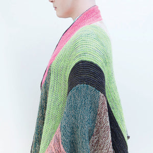 This modular jacket is knit with a worsted weight gauge using fingering weight yarn held double. The construction begins with sleeves in the round. Stitches are picked up and worked towards the center of the garment. The shaping is simple and square for easy garter stitch knitting. A short row collar and I-cord border add a pop of color.