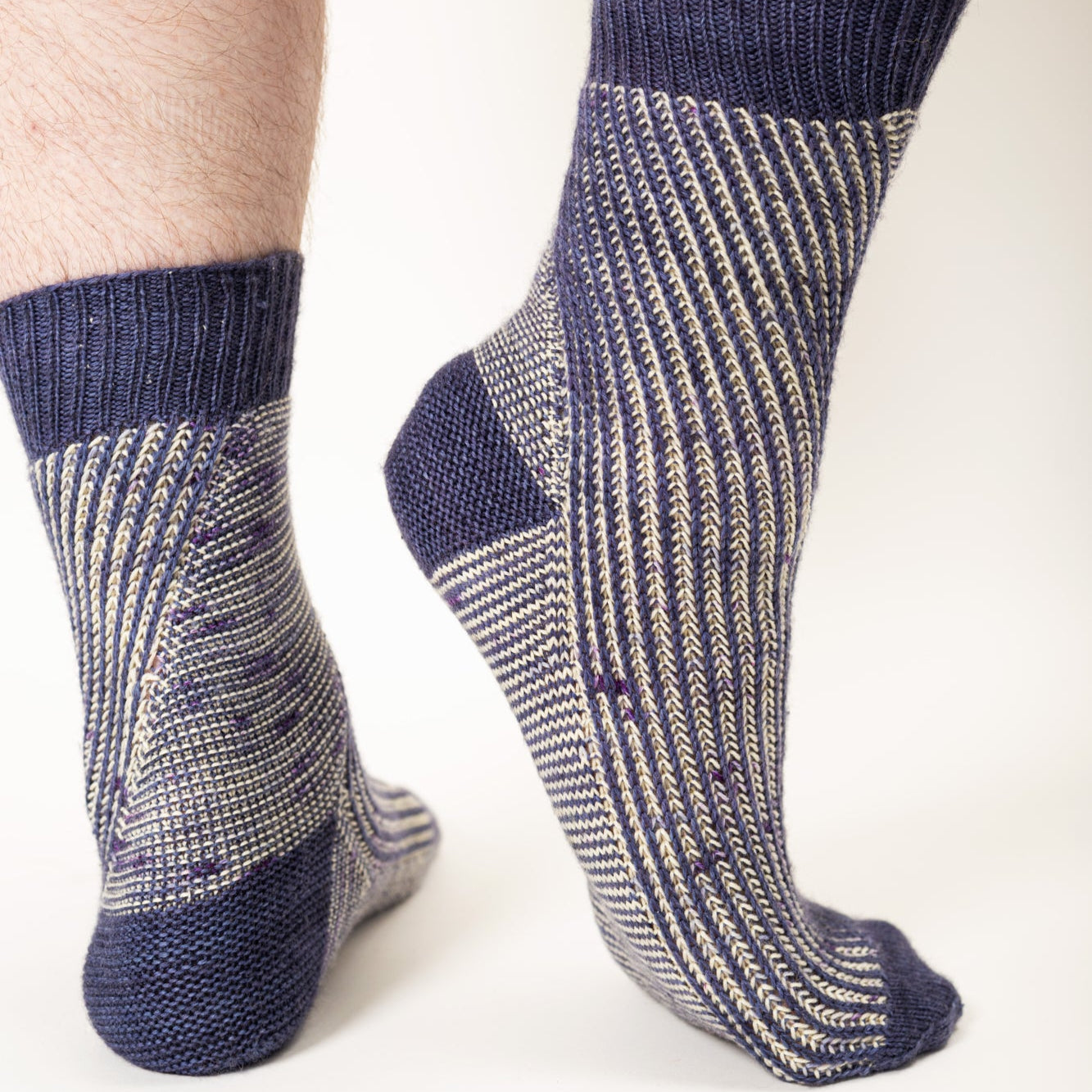 Choose two colours of fingering weight sock yarn to knit these cozy top-down brioche socks!