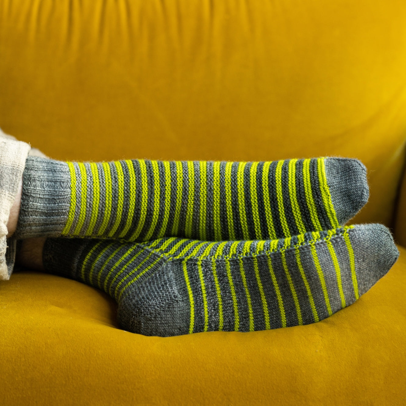 Combine one self-striping sock yarn with a solid main color for these sleek and stripetastic socks!
