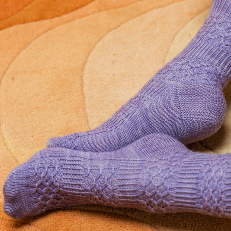 These top-down socks feature fun textures, mirroring textured triangles, and twisted and diagonal chevron ribbing.