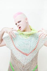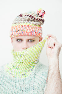 Gather a selection of worsted and DK weight yarns for this top down brioche sweater dress. The neck features a biased section that continues into the yoke. A single increase continues into the sweater body for a flared asymmetrical shape. The sample shows a consistent white color B background mostly with Quince & Co Owl. Color A is a mixture of improvisational stripes in the foreground. You can even hold fingering weight yarns double for a bright accent color. Try on the top down dress as you knit to get the perfect sleeve and body length.Instructions are written using color A and color B. Color A is the foreground color (mint, beige, pink, highlighter yellow) and color B is the background color (mostly white in the body and yellow on the neck). The samples show a consistent color B background color while color A changes in the foreground with color blocks and stripes. Feel free to change colors whenever you like. Changing both colors A & B will create a more striped graphic fabric. Keeping one of the colors consistent will ground the fabric and give it an overall quality of lightness or darkness. Experiment and play with colors and fibers to maintain your interest while knitting this garment.