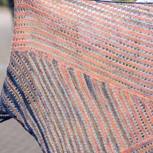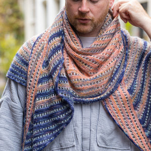 Select one solid or semi-solid main color and one self-striping contrast color to knit this sideways triangle shawl. Begin at the small tip of the shawl and work increases toward the border as you only work with one color at a time. Stripes and slip stitches form the woven checks motif, creating the illusion of the self-striping yarn weaving in and out of the garter ridges. I-cord edges frame the large shawl shape.