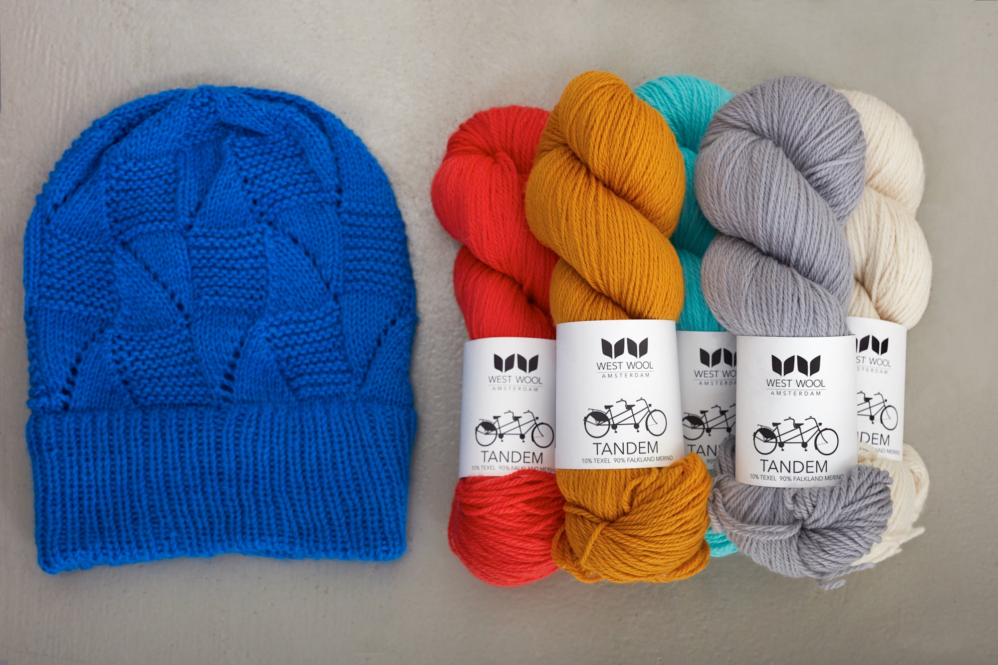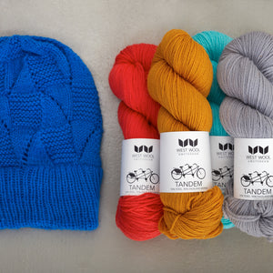 This textural hat begins with an ultra cozy folded brim. Squares of garter stitch and stockinette stitch alternate with yarn over eyelets. One skein of West Wool Tandem will make make this quick to knit DK weight hat. -