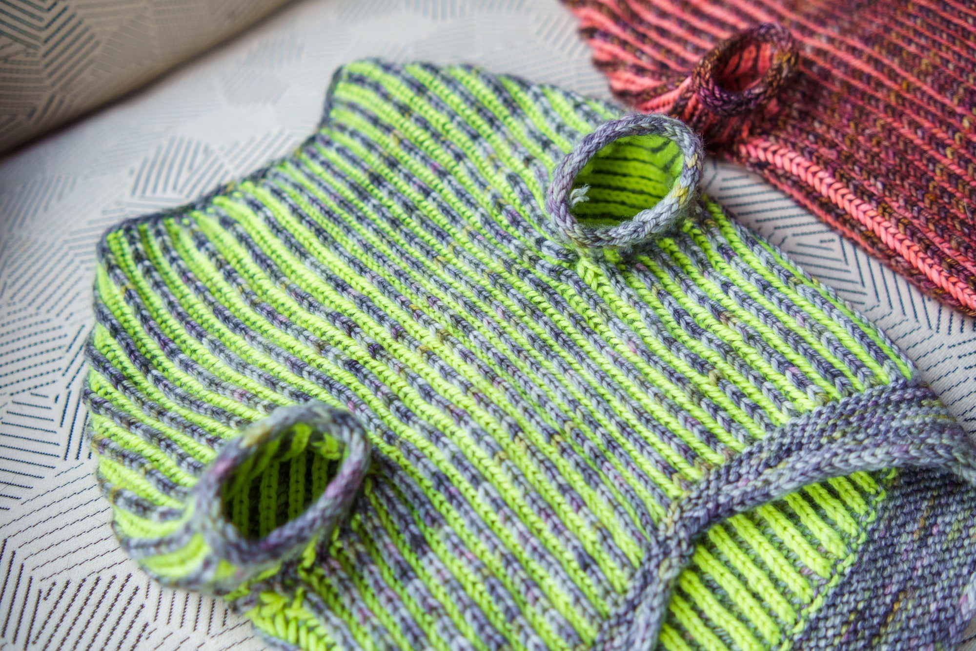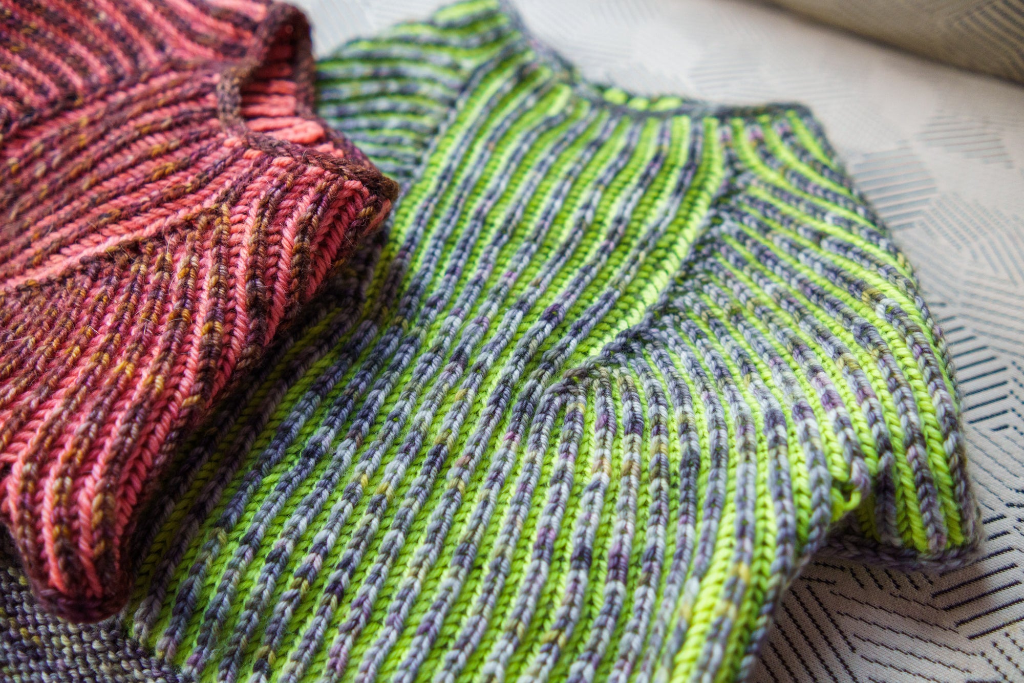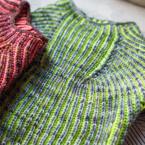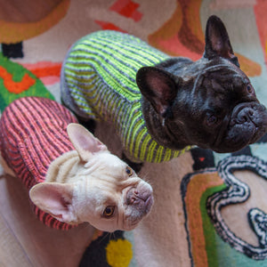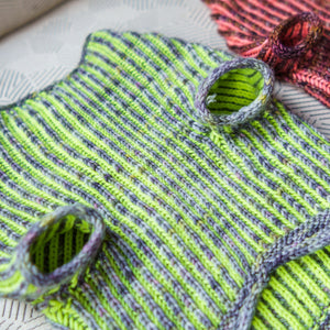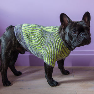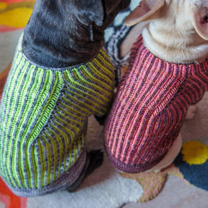 Knit some squishy brioche ribbing to keep your pup cozy and stylish! This sweater is designed for dogs of all sizes ranging from petite pups like Chihuahuas and Dachshunds to Frenchies, Labradors, and even Great Danes! Choose between 9 sizes in the pattern and follow the top-down instructions with lots of notes on how to customize the sizes and length of the pattern to fit your dog. The neckline begins with an I-cord cast on with increases shaping the back of the sweater as it contours around the shoulders, resulting in cute little sleeves. The body continues in the round with notes on how to customize the length of the body. The shape is naturally longer on the back and shorter on the belly with extra short rows to make the back of sweater even longer. Choose two colors of DK weight yarn or add your own color pop personality to your pup’s sweater!