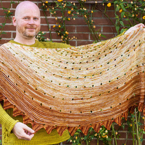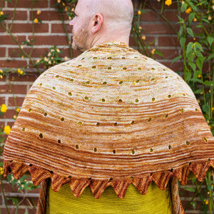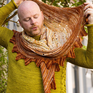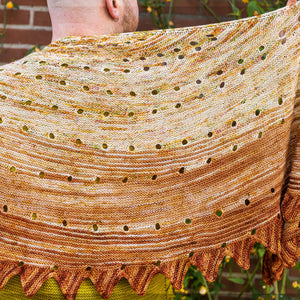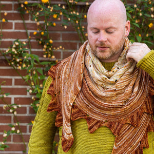 This top-down shawl is knitted with three colorways of fingering weight yarn faded from light to dark. The pattern begins with an I-cord cast on followed by easy garter stitch short rows. Yarn overs accentuate the short row gaps and accentuate the flowy drape of the fabric. A couple striped sections help blend the speckled colorways together for a seamless fade effect. The border features a fun jagged triangle pattern to frame the smooth shape. You can block the points of the shawl by soaking the shawl in water and stretching it with t-pins to exaggerate the large size. This garter stitch shawl is ideal for using singles skeins and it makes a great travel project with easy stitches and fun short rows.