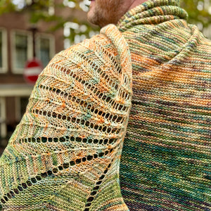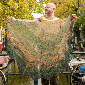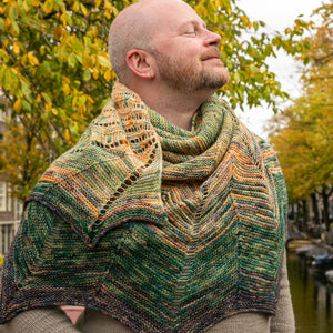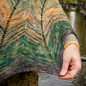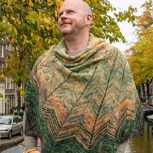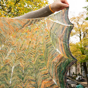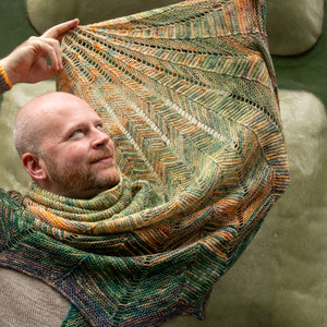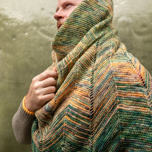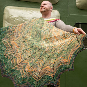 Select a palette of five colors that fade together for this top-down garter stitch shawl. Short rows with chevrons create the unique asymmetrical shape. Yarn over eyelets and decreases highlight the crisp chevron motifs that expand into wide points. You can bind off after any short row wedge to customize the size. Five skeins will yield a large cozy shlanket (shawl + blanket) to keep you stylish and warm.