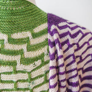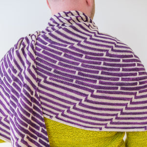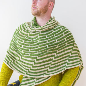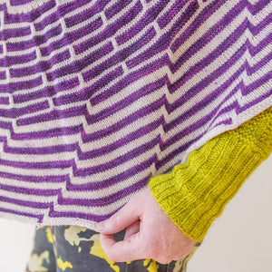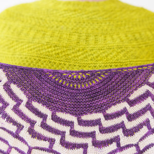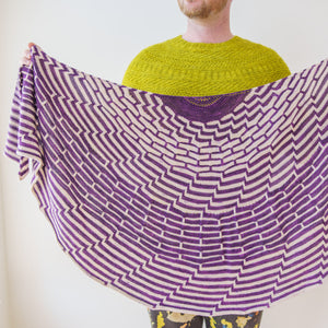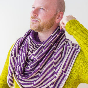 Select two colors of fingering weight yarn to knit this graphic beauty. This shawl begins at the top center and increases seamlessly toward the border with fun slip stitches and stripes. You only work with one color at a time, making this project fun and easy to knit. The pattern includes video tutorials linked in the pattern to help you cast and bind off. Choose two high contrast colors for a bold graphic statement or experiment with softer, more shadowy color for a more subtle color effect. Once you complete your shawl, cast on the Contrast Blast Socks to knit some coordinating socks for your shawl!