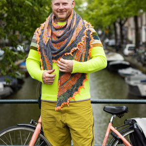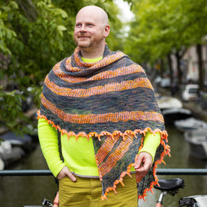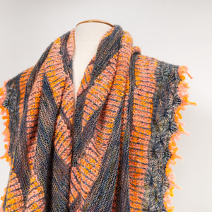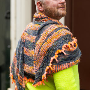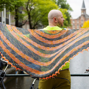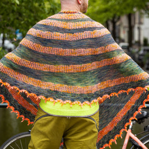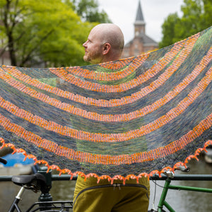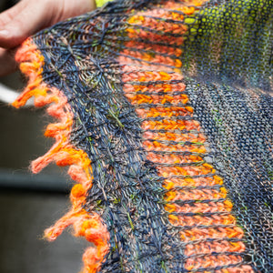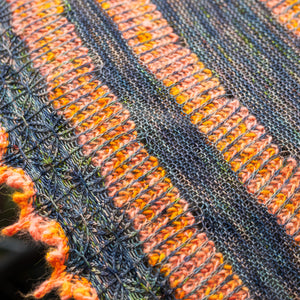 This top-down shawl begins with two-color brioche followed by garter stitch short row rays. Increases at each edge and in the body of the shawl gradually shape the smooth semi-circle. The short row wedges form a cool crescendo effect until you reach the border. The shawl concludes with a twisted rib smock stitch followed by a fluffy picot bind off. I used Qing Fibre’s fingering weight Yak Singles yarn for the main color with their Melted Baby Suri for the cloudy contrast color. The large size is dramatic and fun to knit with the perfect blend of entertaining stitches and relaxing rows.