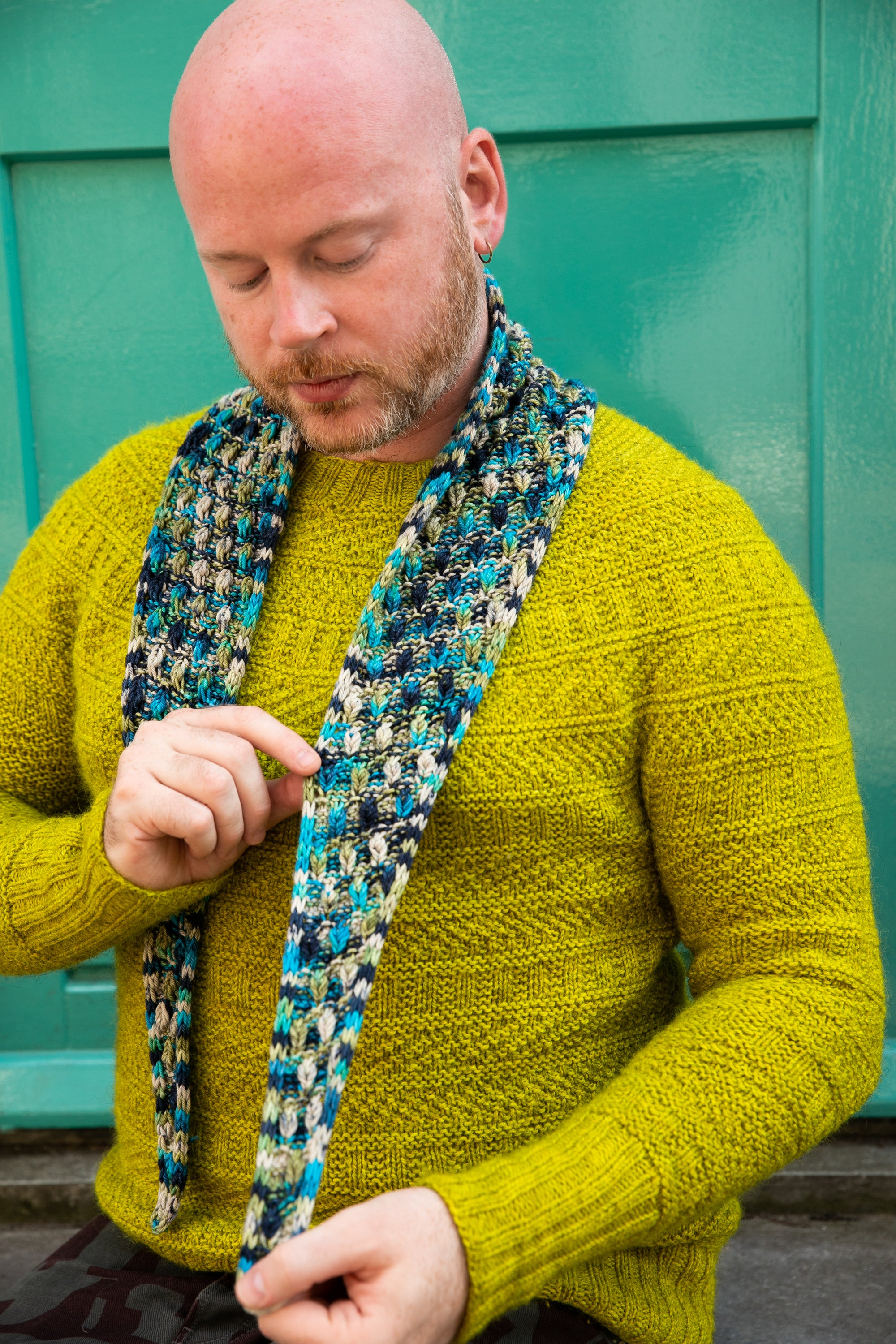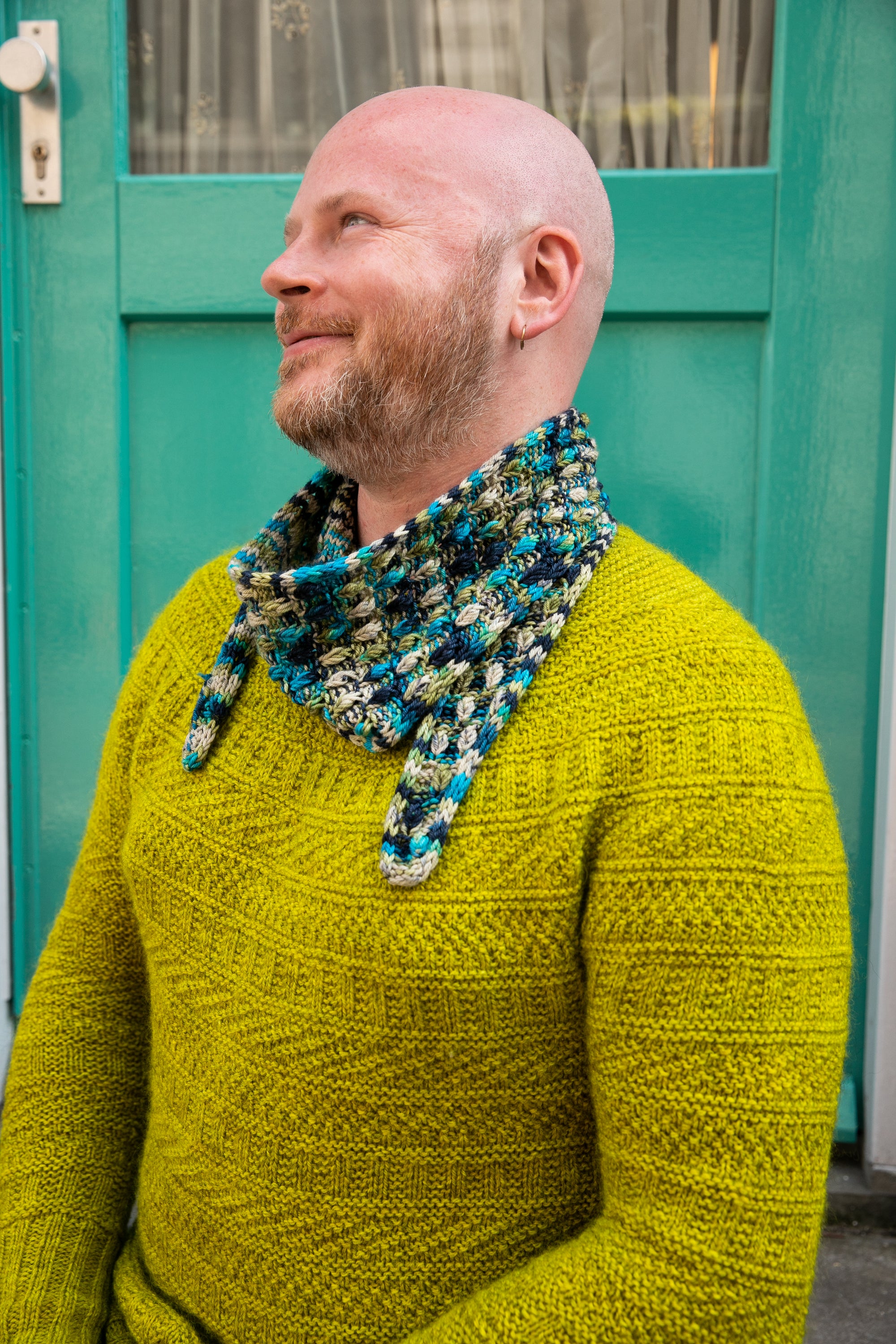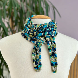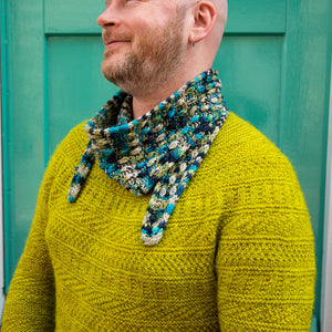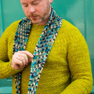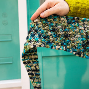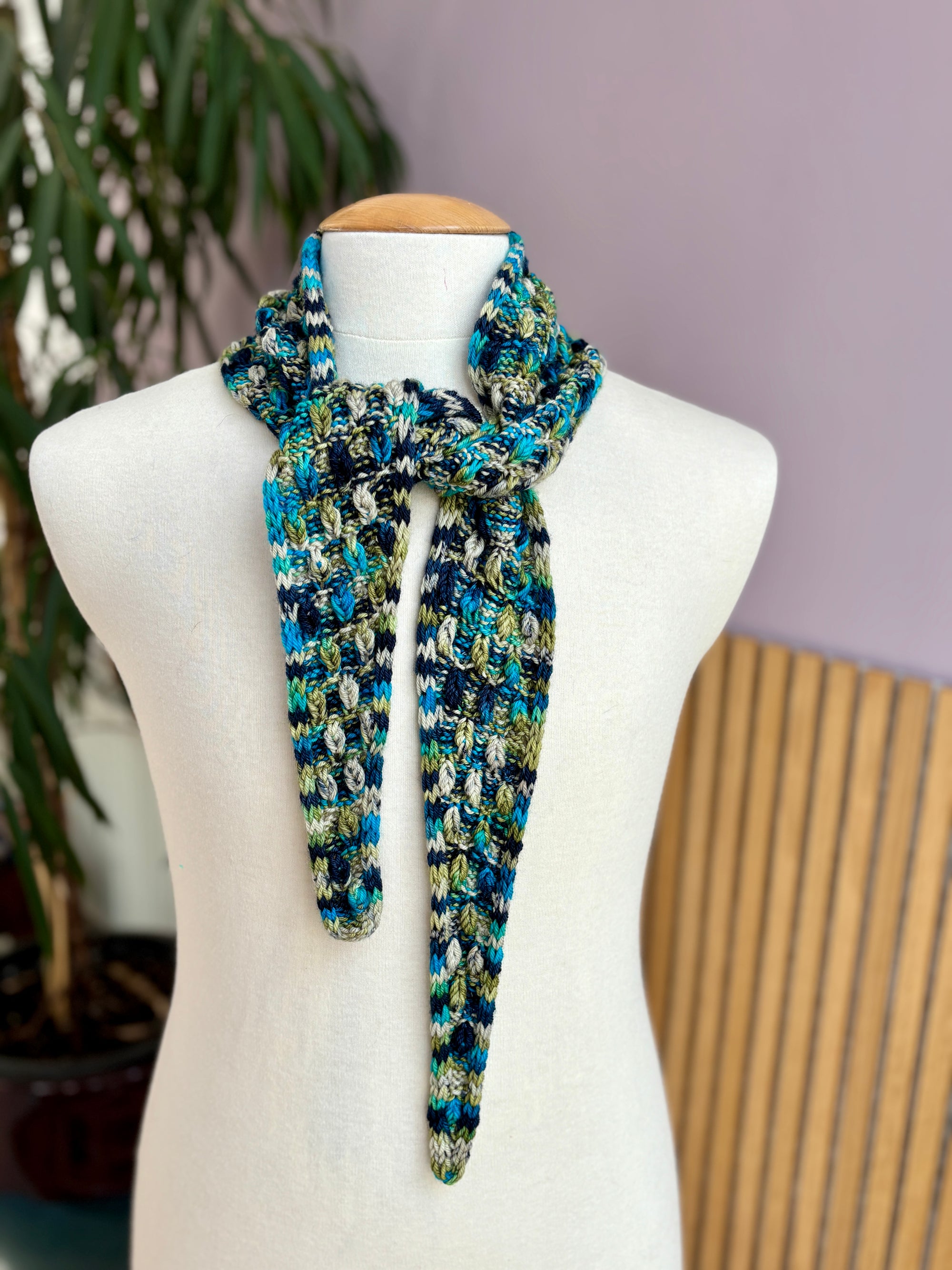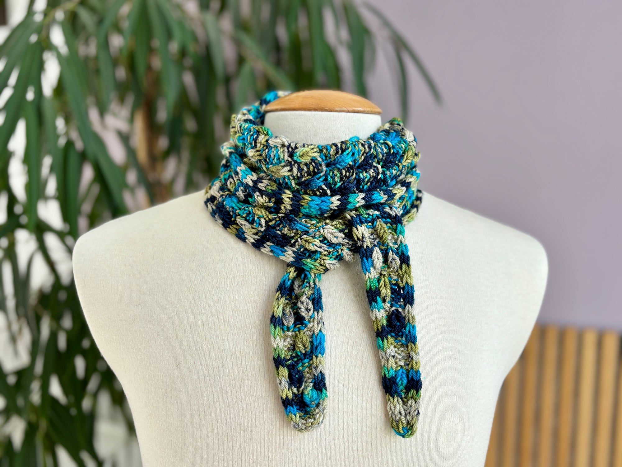 Choose one color of DK weight wool to knit this quick one skein skinny scarf. Begin at the tip with and I-cord Tab Cast On. Increases along the right edge gradually shape the fabric until you reach the middle of the scarf. Then, decrease to the other tip while working the fun droplet stitch pattern. This textured stitch is worked every six rows, producing gathered clusters of color, perfect for splashy variegated yarns and speckled colorways. I used Twisted Ambitions Wicked DK in their variegated Earth colorway and loved how the droplet stitch highlighted the streaks of color in the yarn. It’s mesmerizing to watch the colors unfold!