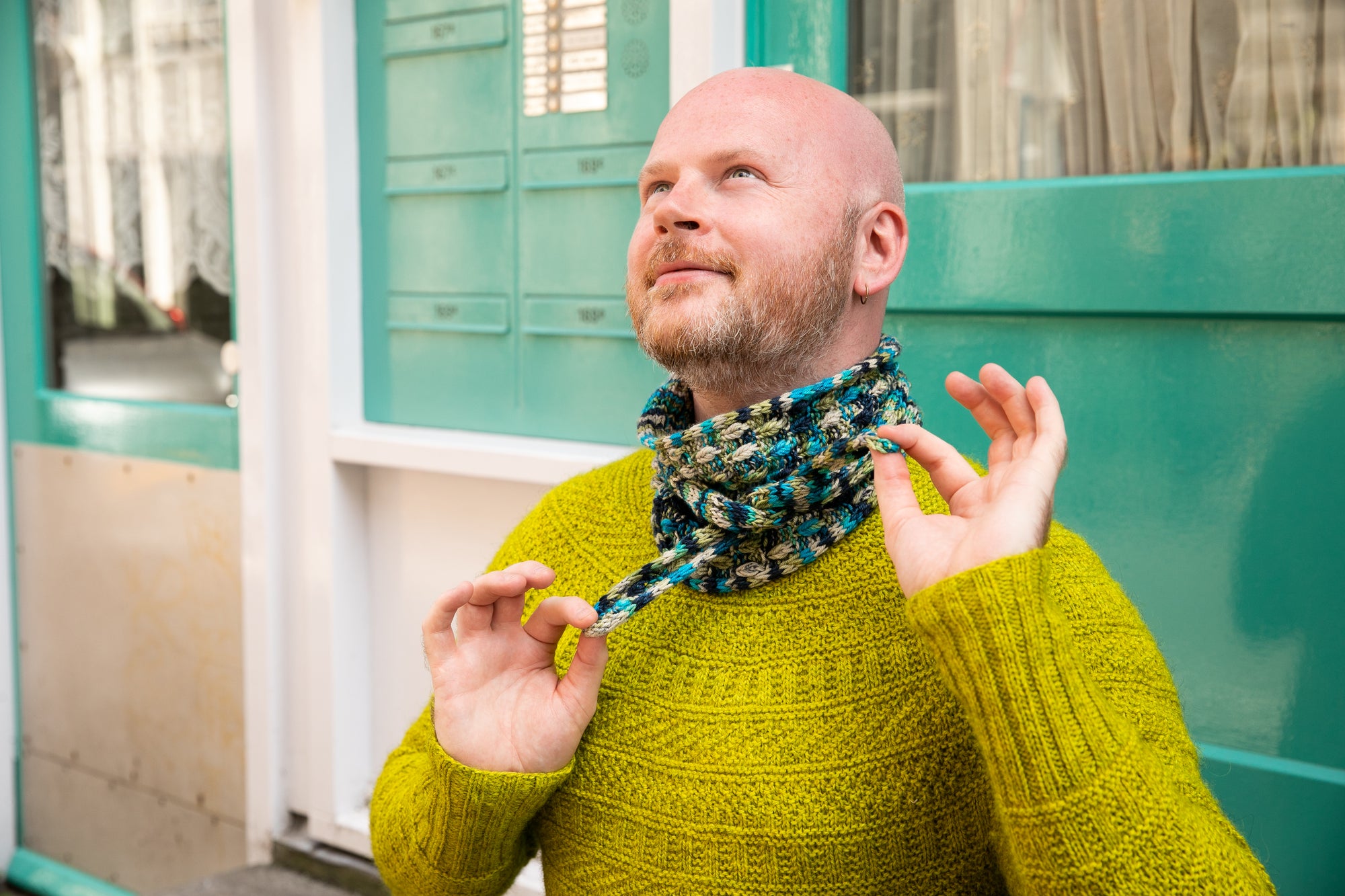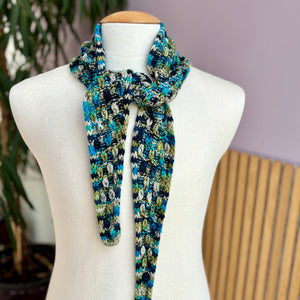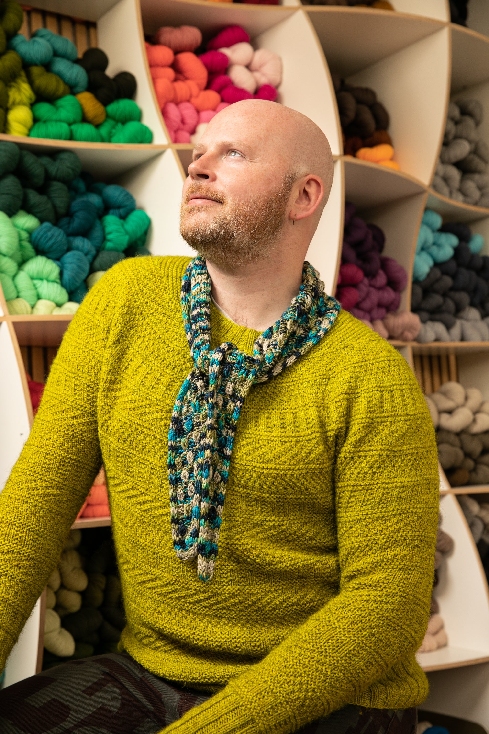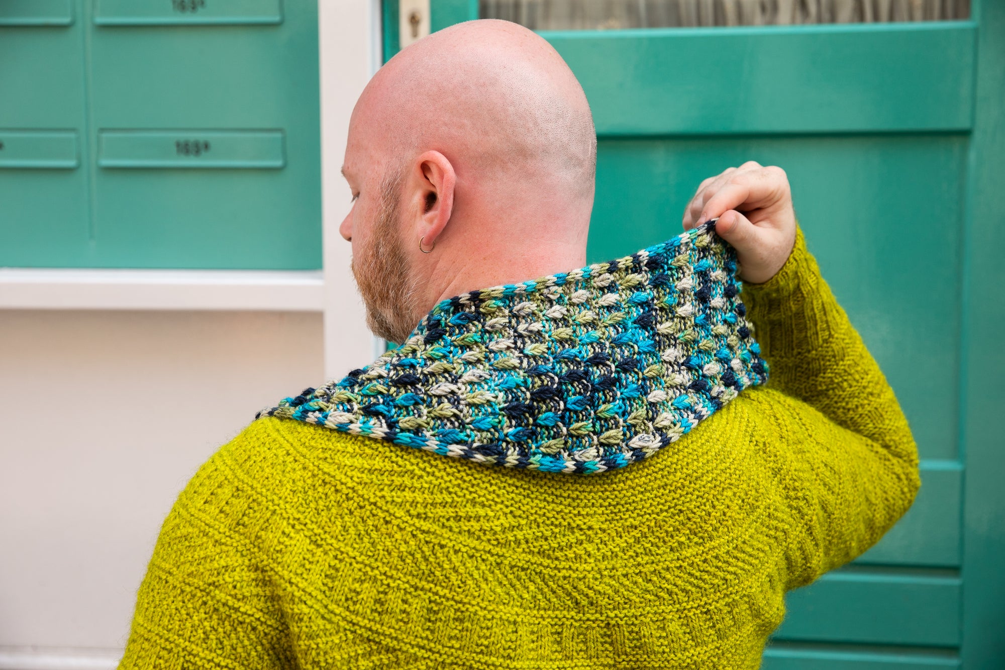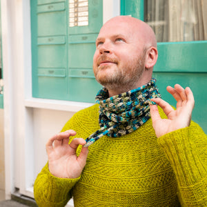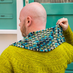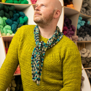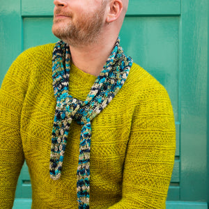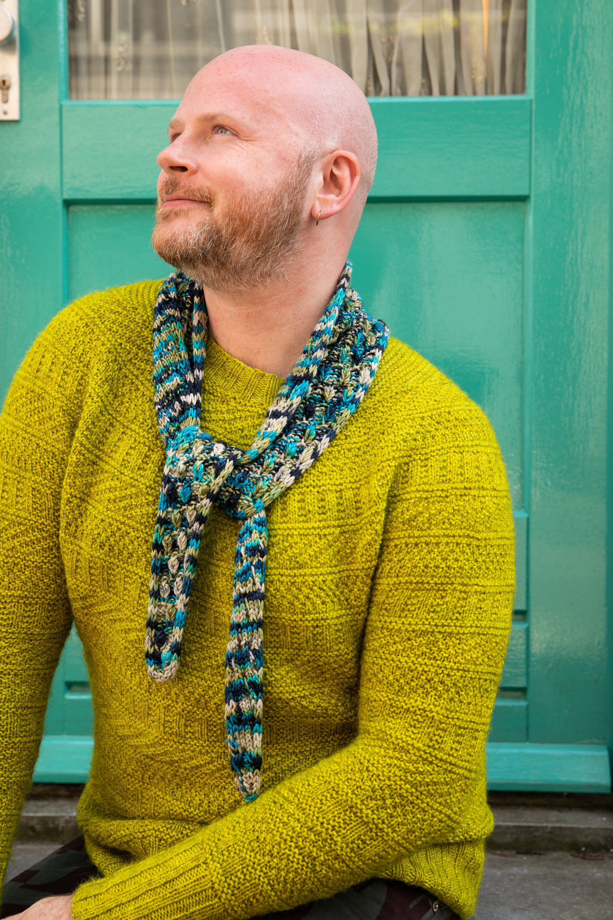 Choose one color of DK weight wool to knit this quick one skein skinny scarf. Begin at the tip with and I-cord Tab Cast On. Increases along the right edge gradually shape the fabric until you reach the middle of the scarf. Then, decrease to the other tip while working the fun droplet stitch pattern. This textured stitch is worked every six rows, producing gathered clusters of color, perfect for splashy variegated yarns and speckled colorways. I used Twisted Ambitions Wicked DK in their variegated Earth colorway and loved how the droplet stitch highlighted the streaks of color in the yarn. It’s mesmerizing to watch the colors unfold!