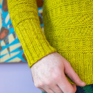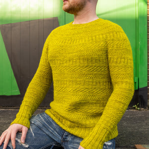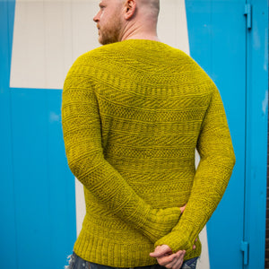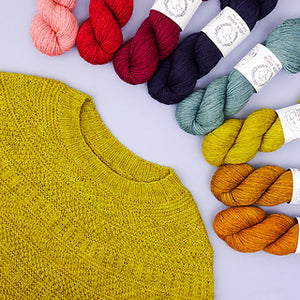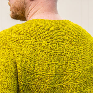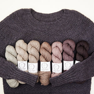 The Dustland Sweater is knit seamlessly from the top collar down to the bottom ribbing. This solid sweater works beautifully with DK or worsted weight yarn. Solid or heathered yarns like La Bien Aimée Corrie Worsted or West Wool Tandem accentuate the crisp stitch definition. Simple knit and purl stitches like moss stitch, diagonal ribbing, and broken rib are framed by garter stitch rows for an easy to knit pullover. Try on the sweater as you knit to customize the length and fit it to your proportions.