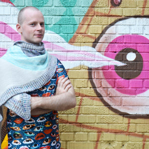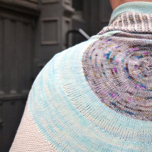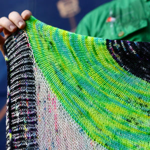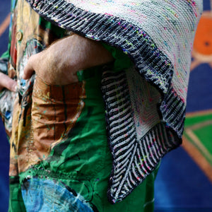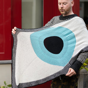 This eye shaped scarf begins at the center with circular shaping for the pupil and iris. The white sections are worked back and forth in garter stitch while being attached to the iris. The final border is worked in the round with two-color brioche for a graphic eyelash effect. Instructions include an optional striped garter stitch border if you prefer simple garter stitch to brioche.