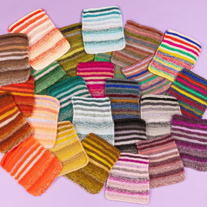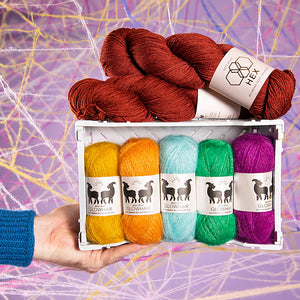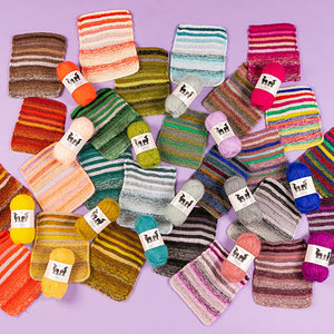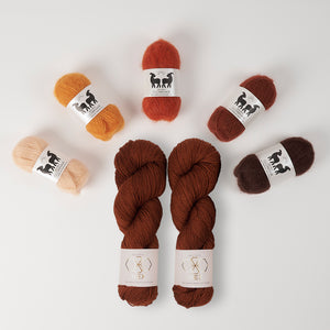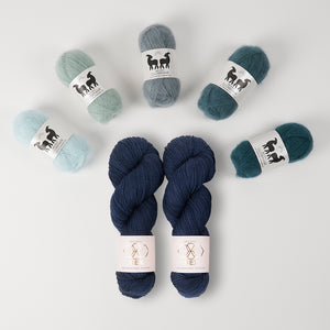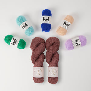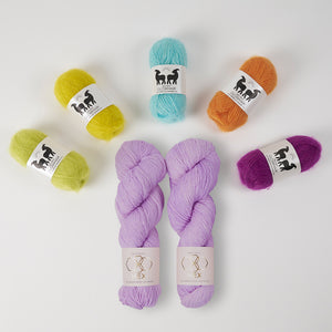 CC’s (contrast colors) - 5 colors lace weight mohair (25g each color) in contrasting color pops like West Wool GlowhairSometimes the CC mohair is used on its own as fluffy stripes and other times the mohair is marled with the MC wool for a glistening halo effect. Make sure you have the recommended yardage if you are substituting yarns.