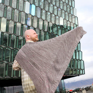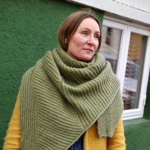 This plush shawl is knitted with one strand of wool held together with one strand of lace weight mohair silk. Cast on and work single color brioche with increases to gradually expand the size. A decrease is added to create a biased detail in the fabric. The rhythmic rows are very relaxing to knit. Maximize the size by knitting as many repeats as you like or simply bind off early for a smaller size. You can hold one strand of fingering weight and one strand lace weight mohair for a lightweight version or knit a winter weight version with one strand DK weight held together with one strand lace weight mohair.