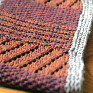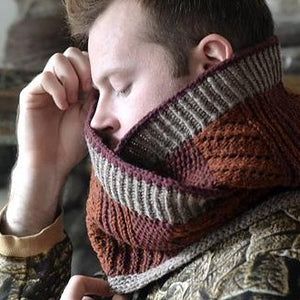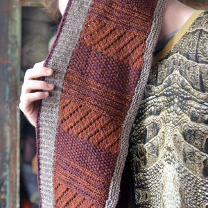 Fingering weight yarn is held double for a worsted gauge and marled fabric effect. The majority of the cowl is worked sideways with three colors in diagonal lace, corrugated ridges and seed stitch. The twisted rib and garter stitch edges are worked in the round with a fourth color.
