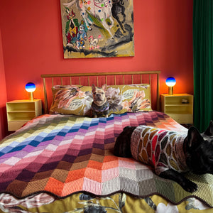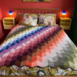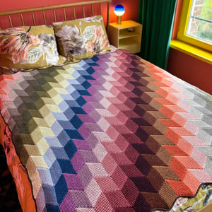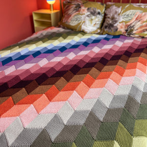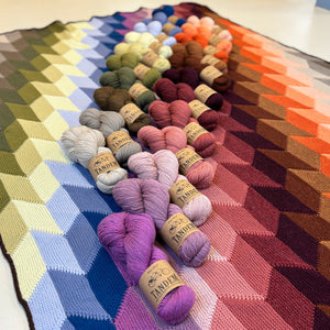 Swaddle yourself in stitches with this geometric woolly blanket. Each section is knit in horizontal strips with one color at a time as you modularly knit the sections together, resulting in zero seaming! This DK weight blanket is ideal for single skeins and leftover bits of DK weight yarn. You can also hold two strands of fingering weight yarn together for the color blocked parallelogram shapes. This blanket was named after the Hvammsvík Hot Springs in Iceland, where you can soak in warm pools of water while looking at the mountainous and mossy landscape. I was inspired by these natural Icelandic colors for the color palette in the large blanket. Gritty neutrals with grungy pops of color reflect the rugged beauty of this magical island filled with sheep. Choose between three sizes to knit a small baby blanket, lap throw, or knit the large size, which is perfect for snuggling on the couch while knitting and watching movies.