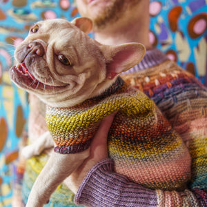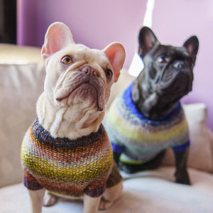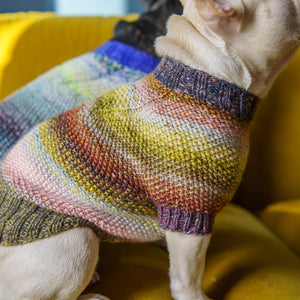 Dive into your collection of leftover fingering weight yarns and knit this adorable stashbusting sweater for your dog! Choose between nine sizes from petite pups to big breeds. The pattern includes several sizing notes to help you customize your chosen size to perfectly fit your pup. The length of the yoke, body, and legs are very easy to customize by working more or fewer rounds of seed stitch. There is an optional harness hole in the pattern, so you can style the sweater on top of your dog’s harness. Increases along the back and short rows help lengthen the back of the sweater, resulting in a sweater fit that is equal parts cute and functional. Hold two strands of fingering weight yarn throughout the entire project as you mix and marl your colors to create a melted color landscape. Marled knitting is so much fun and you’ll soon be addicted to the constantly changing colors, so you can bust through your stash and knit cozy dog sweaters for all of your friends!