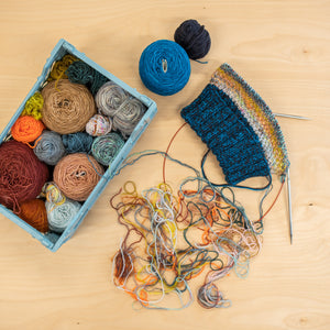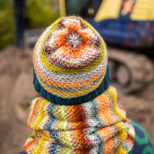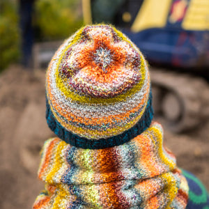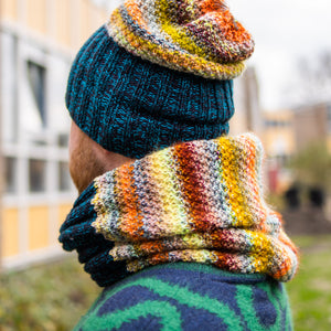 This brimmed hat is a quick and easy stashbuster. Hold two strands throughout the entire hat to use lots of leftover bits of fingering weight yarn. The ribbed brim keeps your ears toasty warm while the moss stitch fabric displays all your favorite colors. Instructions include tips on marling and how to get a beautifully blended fabric. Dive into your stash and melt colors together for this beginner friendly hat.