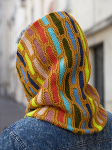 Gather a colorful collection of DK weight yarns to create this easy to knit bricks cowl. The stripes and slipped stitches are knit in the round as the bricks increase in size to form a hooded effect. The double thick fabric is a super cozy layer for autumn and winter. Choose a main color to frame all of the contrasting brick color pops. DK weight yarn is recommended, but you could also hold fingering weight yarn double.All rights reserved. Pattern for personal use only.