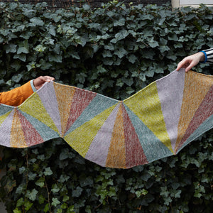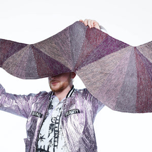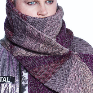 Rainbow Road is a simple yet playful shawl knitted with two strands of lace or fingering weight yarn in a purple or a rainbow palette. Short row wedges in garter stitch create the curvy shape as they increase in size – very addictive to knit! Place the wide end of the shawl on your shoulder first, and then wrap the narrower end around your neck once or twice. The marled fabric is very squishy and warm, so it is the perfect grab-and-go accessory.