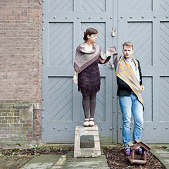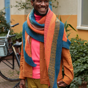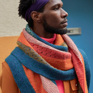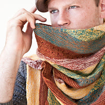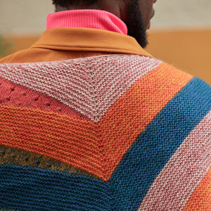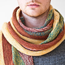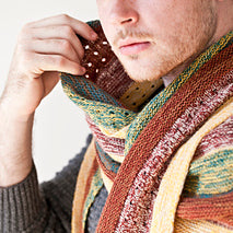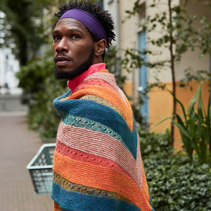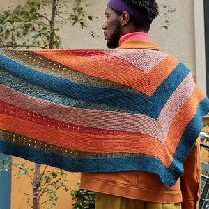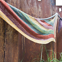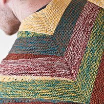 This top-down shawl uses lace or fingering weight yarn in six different colors. Hold two strands of yarn together and knit wide garter stitch stripes in this top-down triangular shawl.
