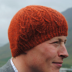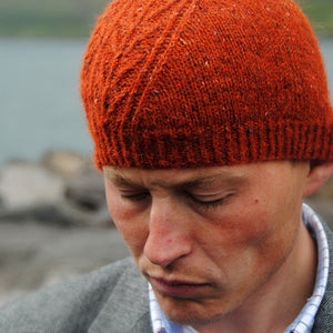 This stylish beanie hugs the head with its soft and tweedy fabric. A quarter of the hat features twisted stitches and cables worked on a bias. This biased section also gives the brim a slight asymmetric angle that frames the face with subtle fierceness.