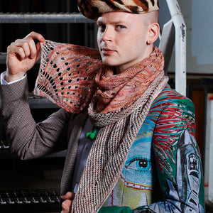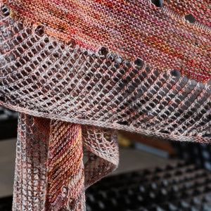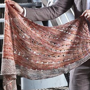 This top-down shawl begins with an I-cord cast on and short wedges that create a layered semi-circular shape. A contrasting color in stockinette stitch divides the garter stitch layers with yarn over rows. A contrasting mesh border decorates the curved shape for a flowy finish.