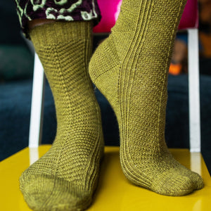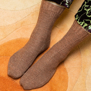 These top-down socks are filled with fun textures. The leg features a diagonal chevron rib that flow along the top of the leg into the top foot. The back of the leg features mirroring textured triangles flanked by twisted ribbing. Choose a solid or heathered sock yarn like Life in the Long Grass Earth to make the detailed stitches shine. The pattern includes five size circumferences with instructions to help modify the length of the leg and foot to achieve the perfect fit.