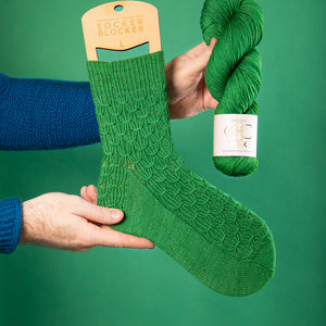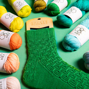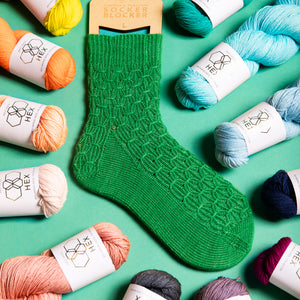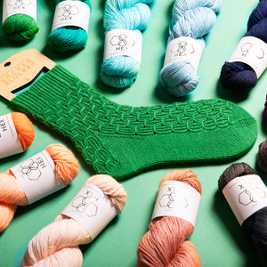 These textured socks are knitted top-down with one color of fingering weight sock yarn like West Wool HEX. The twisted rib cuff flows into a gather smock stitch for the leg and foot. The smocked stitches also continue into the Heel Flap. Instructions include photos and video tutorials to assist with the smock technique. Customize the size of the leg and foot by working more repeats for a long length or stop early for a shorter leg and foot length.