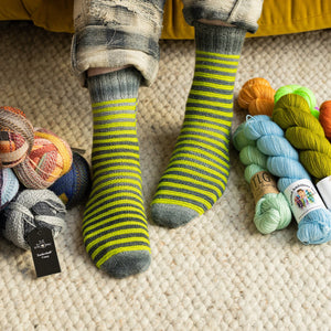 These top-down socks feature a fun modular construction. Begin with 2x2 ribbing for the Cuff, then knit a garter stitch rectangle flat for the front leg and top foot. The back leg is then knitted in stockinette stitch with thin stripes, resulting in a staggered geometric striping pattern on the leg. The heel flap is knitted in garter stitch followed by the gusset and sole. The striped sections are knitted together for a seamless modular construction. Combine one solid skein of sock yarn with a self-striping main color like Schoppel Wolle Zauberball Crazy to create these stripe-tastic color changing socks!